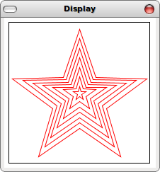 Of course, we're not limited to hand constructed Scenes since we know how to use recursion over the natural numbers. Example2 implements a recursive method, stars, that builds a Scene. Our base-case returns the EmptyScene, and our recursive case places (placeImage) a Star of the given size in the Scene returned by the recursive call.public class Example2{ Example2(){} // Create a Scene with nested stars of decreasing size Scene stars(int size){ if(size <= 4){ return new EmptyScene(200, 200); }else{ return this.stars(size-15) .placeImage(new Star(size, "outline", "red"), 100, 100); } } Scene scn = this.stars(100); public static void main(String[] args){ World.display(new Example2().scn); } }We start with a size of 100, and display the result. Running this example results in a window similar to the following: