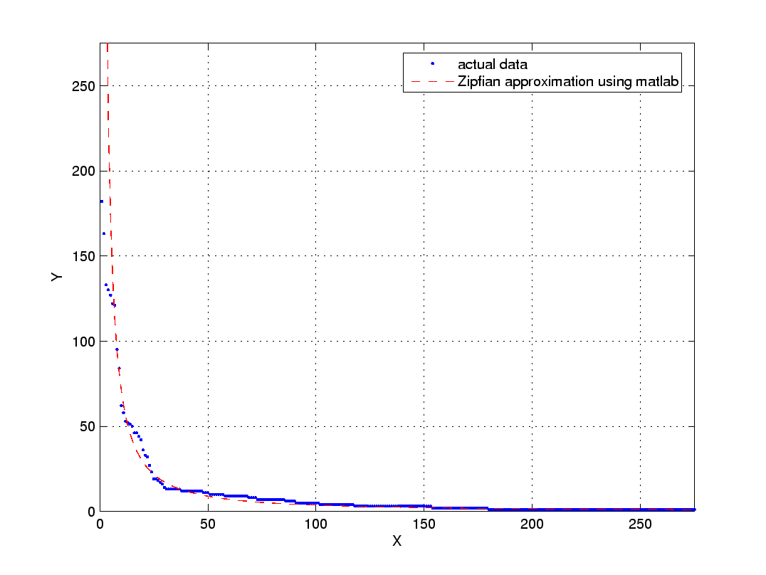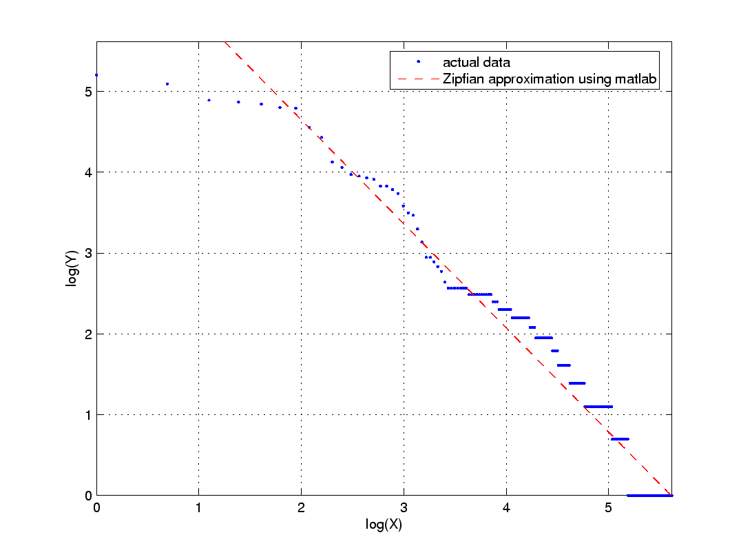 Your task is to find the best fit Zipfian model for this data, i.e., the parameters of the red curve, by first finding the best fitting straight line for the log-log data using the least squares technique. Follow the detailed example given in class. As a reminder, if the log-log data points are represented by