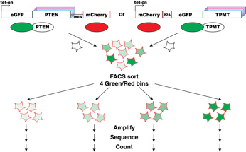 The VSP assay was used to measure the steady state abundance in parallel of thousands of protein variants of Phosphatase and tensin homolog (PTEN) and thiopurine methyltransferase or thiopurine S-methyltransferase (TPMT) protein variants in parallel. Barcoded, site saturation missense libraries of PTEN and TPMT (Jain & Varadarajan, 2014; Starita et al., 2015) were separately recombined into engineered landing pad cells. The EGFP/mCherry ratios of cells harboring each library spanned the range previously characterized for WT and known destabilized variants. Each library was then flow sorted into EGFP/mCherry bins ranging from a low ratio (unstable) to high ratio (stable) variants. Genomic DNA was purified from each bin, and then barcodes were sequenced and tallied. A variant stability score was computed, with 0 meaning unstable, 1 meaning wild-type stability and >1 meaning more stable than wild type.