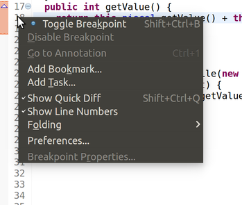 Select Toggle Breakpoint. (There is also a shortcut key to do this: on my machine, it is Ctrl+Shift+B, as indicated by the text on the right side of the context menu.) Visually, this will add a little blue circle in the margin to the left of the line number. That signifies a breakpoint, which will cause your program to pause whenever you execute your program in debugging mode, and execution reaches that line. You can repeat this process to remove the breakpoint again, when you’re done debugging the problem.