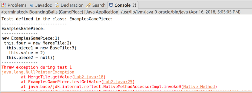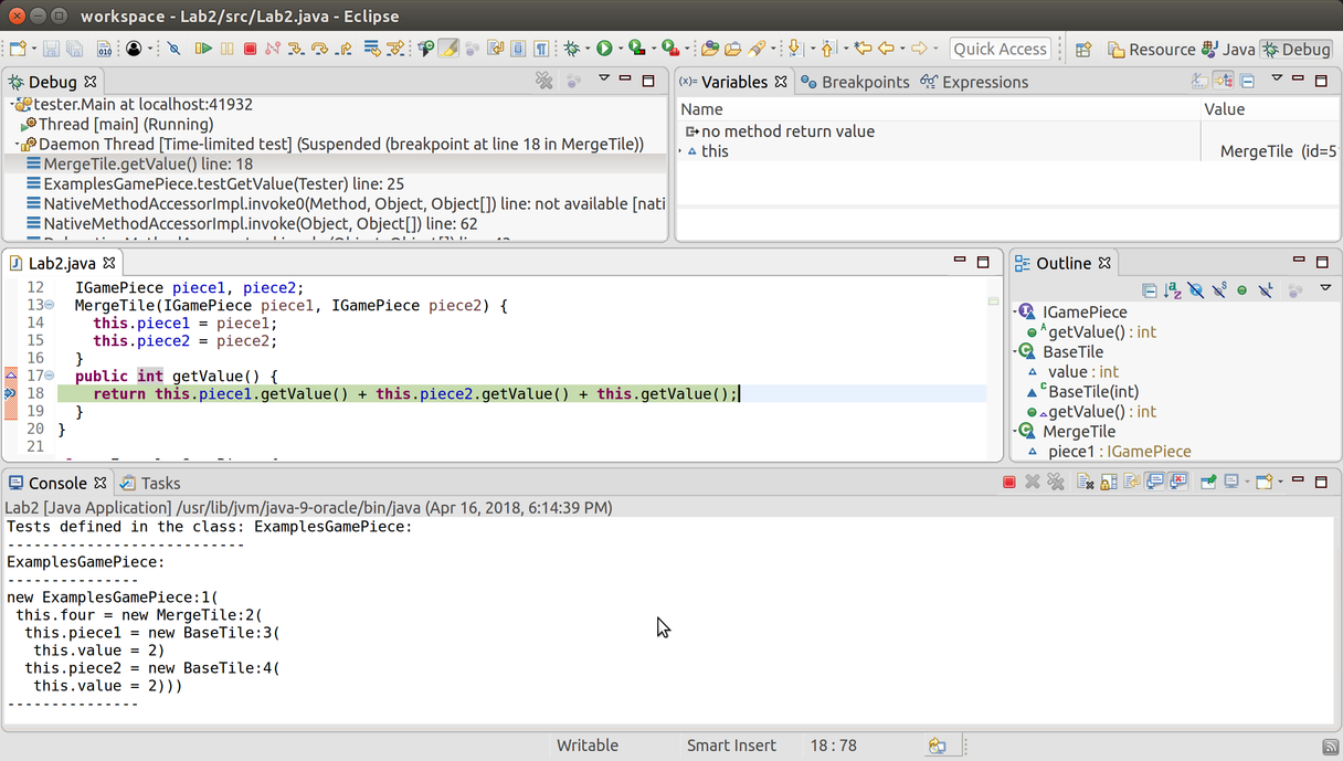 When you get to line 18, start stepping through the program again. Using Step into is tedious, since it will take us into the BaseTile implementations. Using the other two stepper buttons doesn’t seem to work. This is because we have three method calls all on one line, and Eclipse is quite simplistic when it comes breapoints and to your program’s layout. Add newlines before the plus signs on line 18, to split the three method calls onto three separate lines. Now, you can successfully use Step over to run the entirety of this.piece1.getValue() as a single step, and similarly for this.piece2.getValue(). Now use Step into to step into the call to this.getValue(). The stack trace in the Debug tab has grown, and nothing else has changed. Keep doing this a few times, until you recognize the problem: we are recurring into the exact same method on the exact same object – of course we’re stuck in an infinite recursion! This implementation does not properly follow the template: fix it, by eliminating the call to this.getValue() altogether, since it’s unneeded.