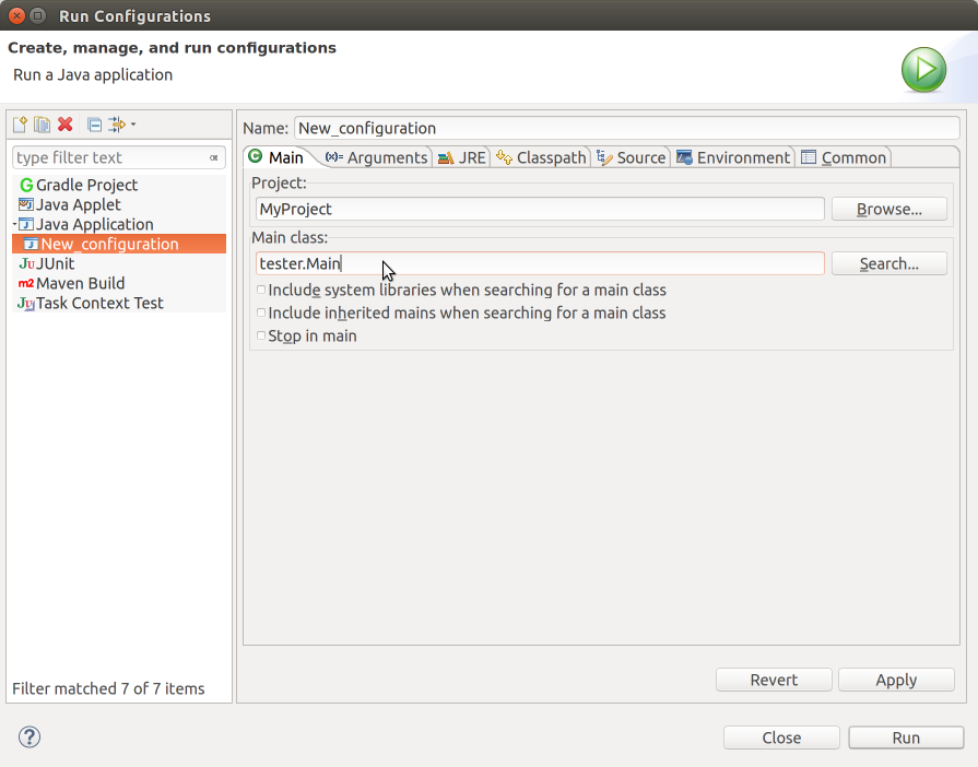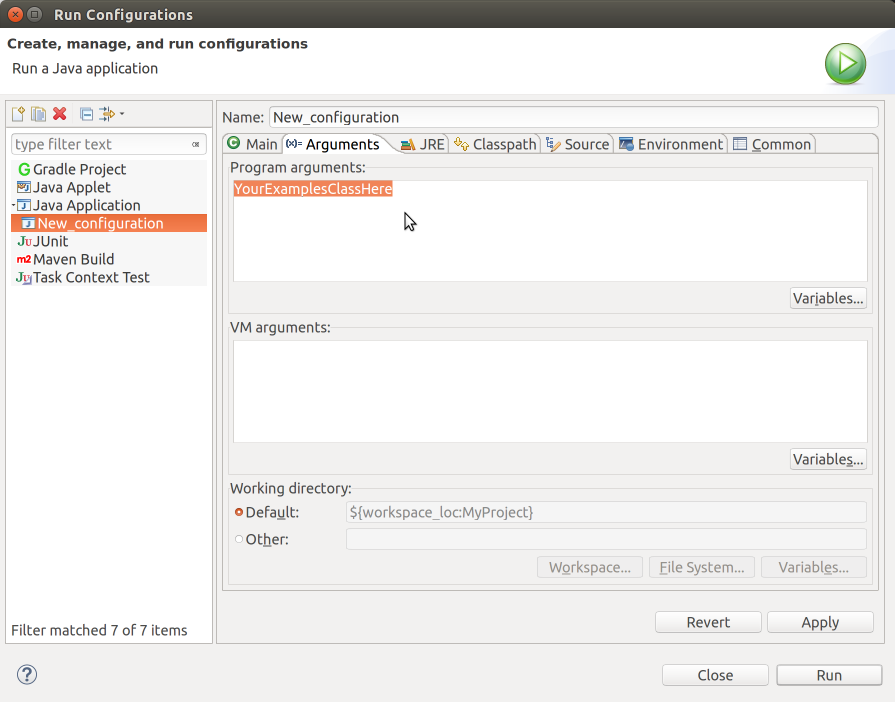 Click on the tab (x)= Arguments. In the Program arguments text field enter the name of your examples class.
