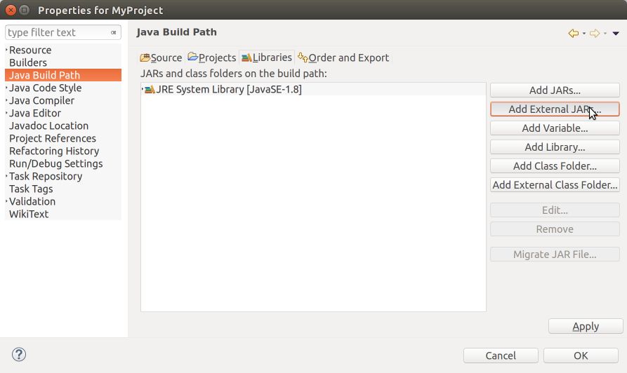 In the list on the left, select the Java Build Path, then select the Libraries tab.